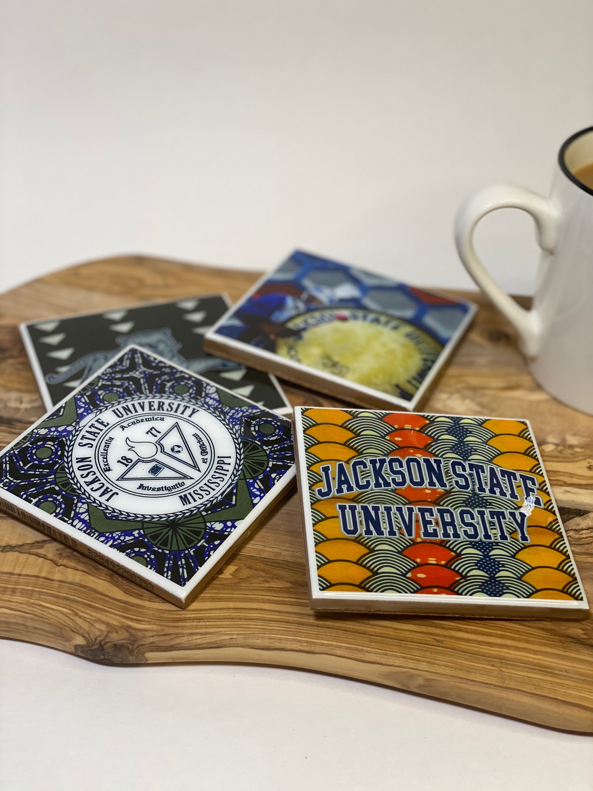 This set of four coasters features images from Jackson State University.