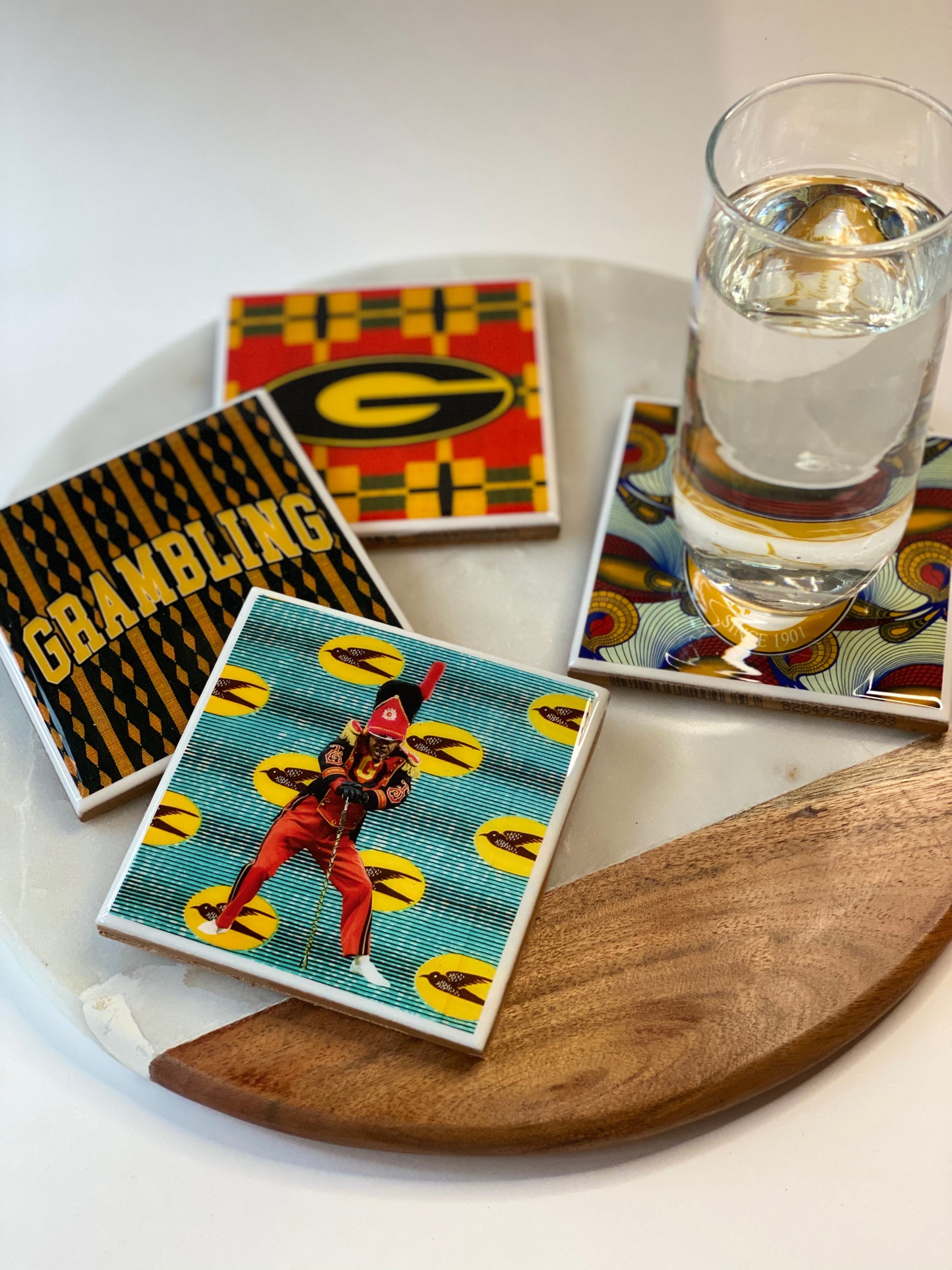 Each coaster is made of ceramic tile and sealed with a heat resistant non-toxic resin. Coasters are backed with cork for safe placement on any surface and measure 4 in. x 4 in.