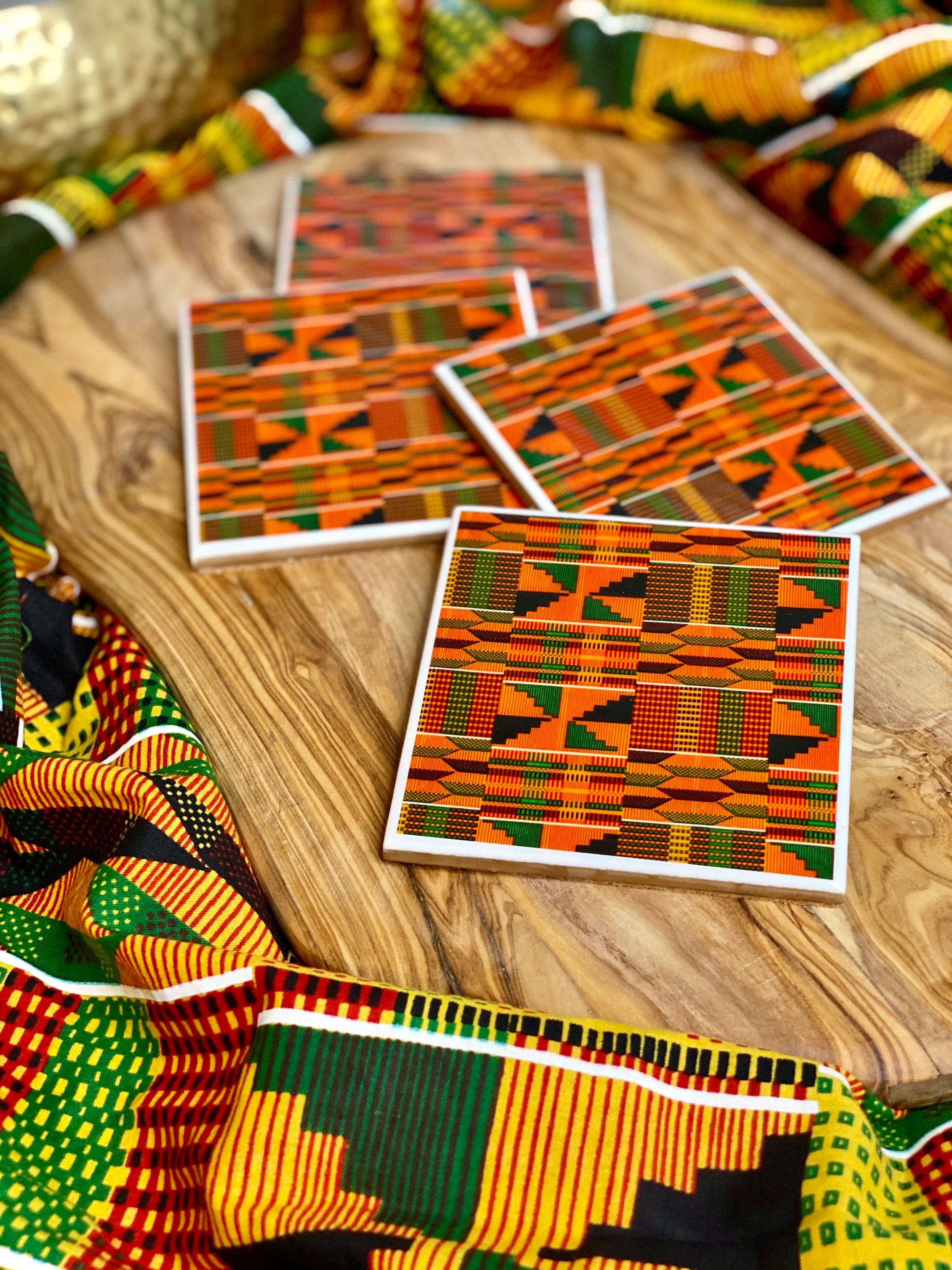 Each coaster is made of ceramic tile and sealed with a heat resistant non-toxic resin. Coasters are backed with cork for safe placement on any surface and measure 4 in. x 4 in.