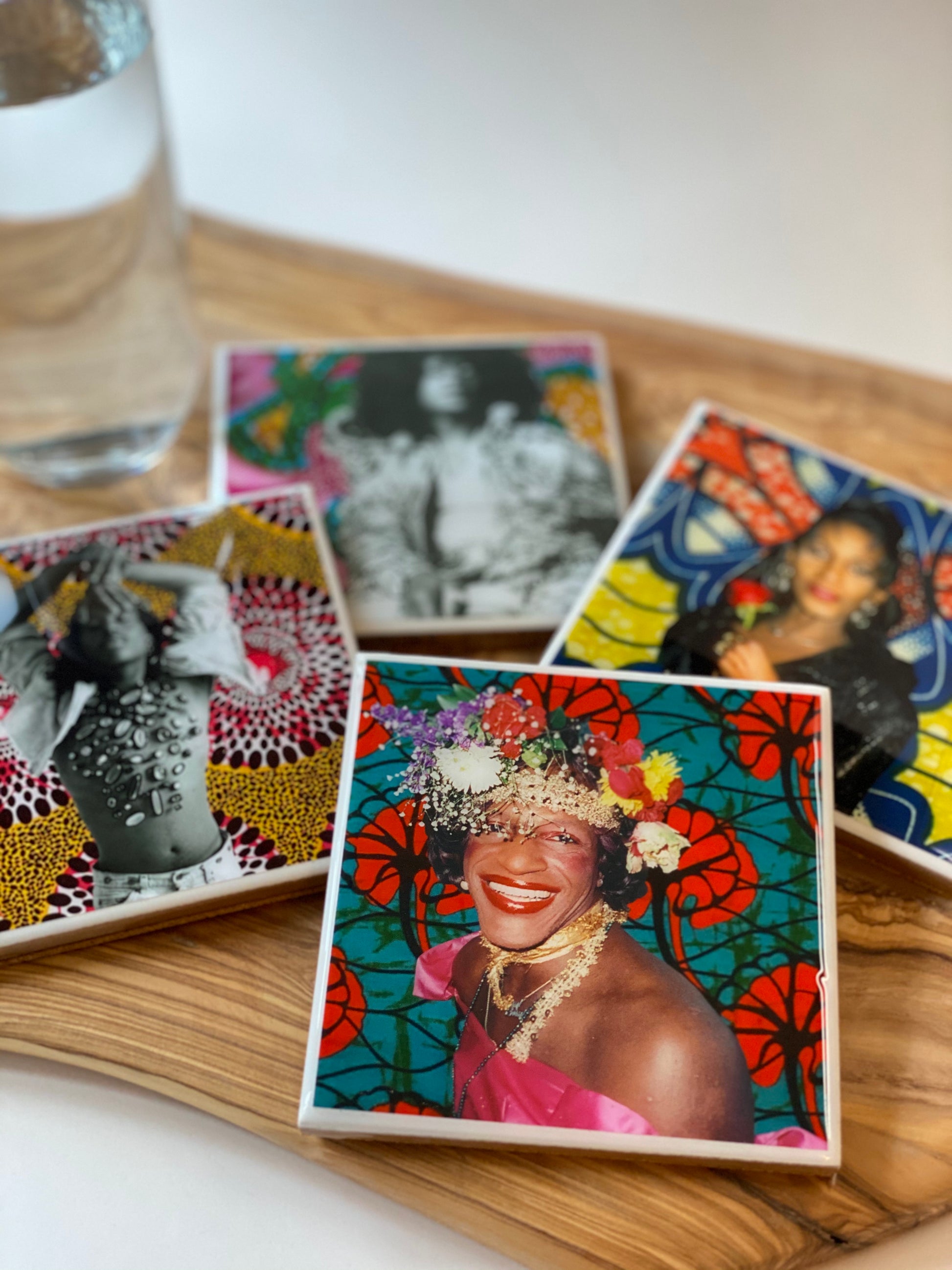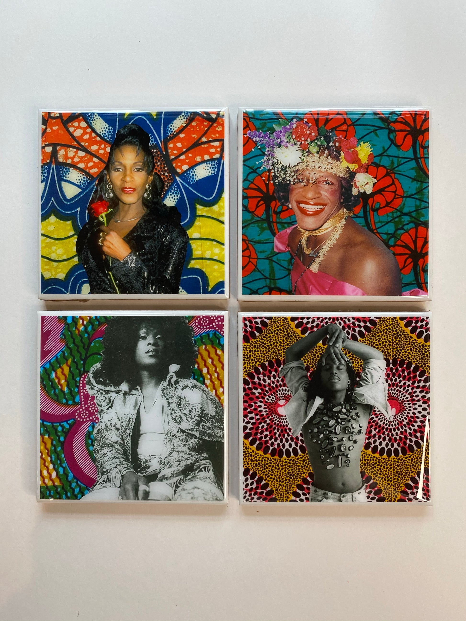 This set of four coasters features images of Marsha P. Johnson, Willie Ninja, Sylvester, and Lady Chablis. #BlackTransLivesMatter