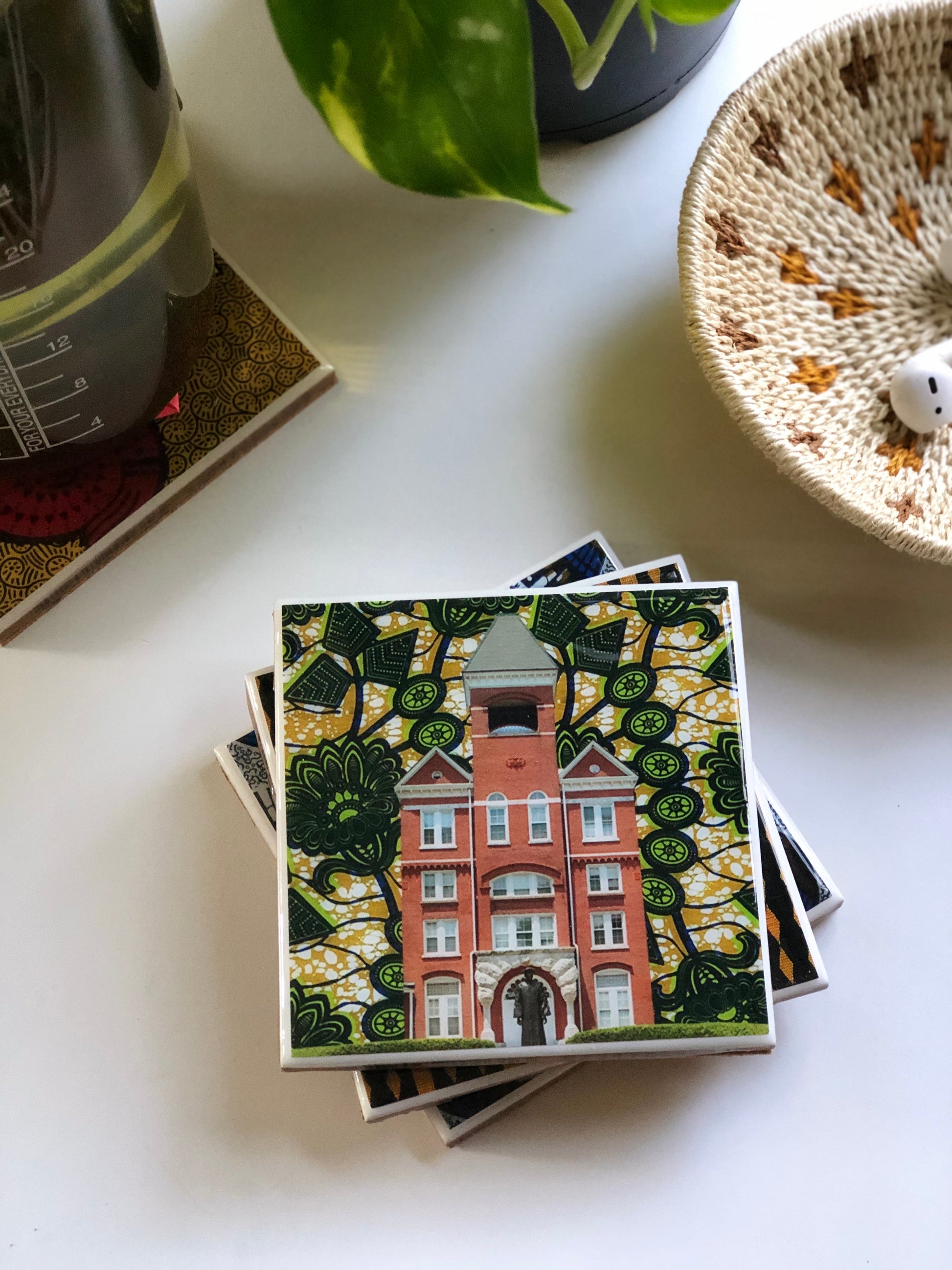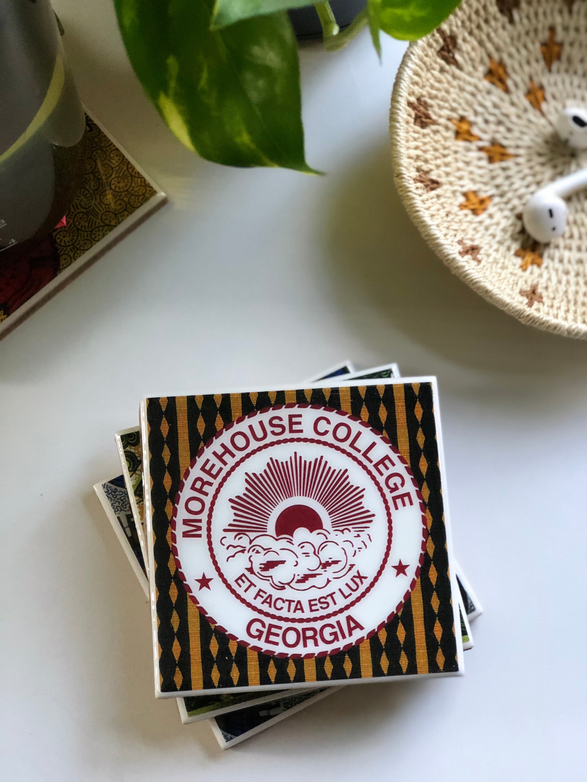 Each coaster is made of ceramic tile and sealed with a heat resistant non-toxic resin. Coasters are backed with cork for safe placement on any surface and measure 4 in. x 4 in.