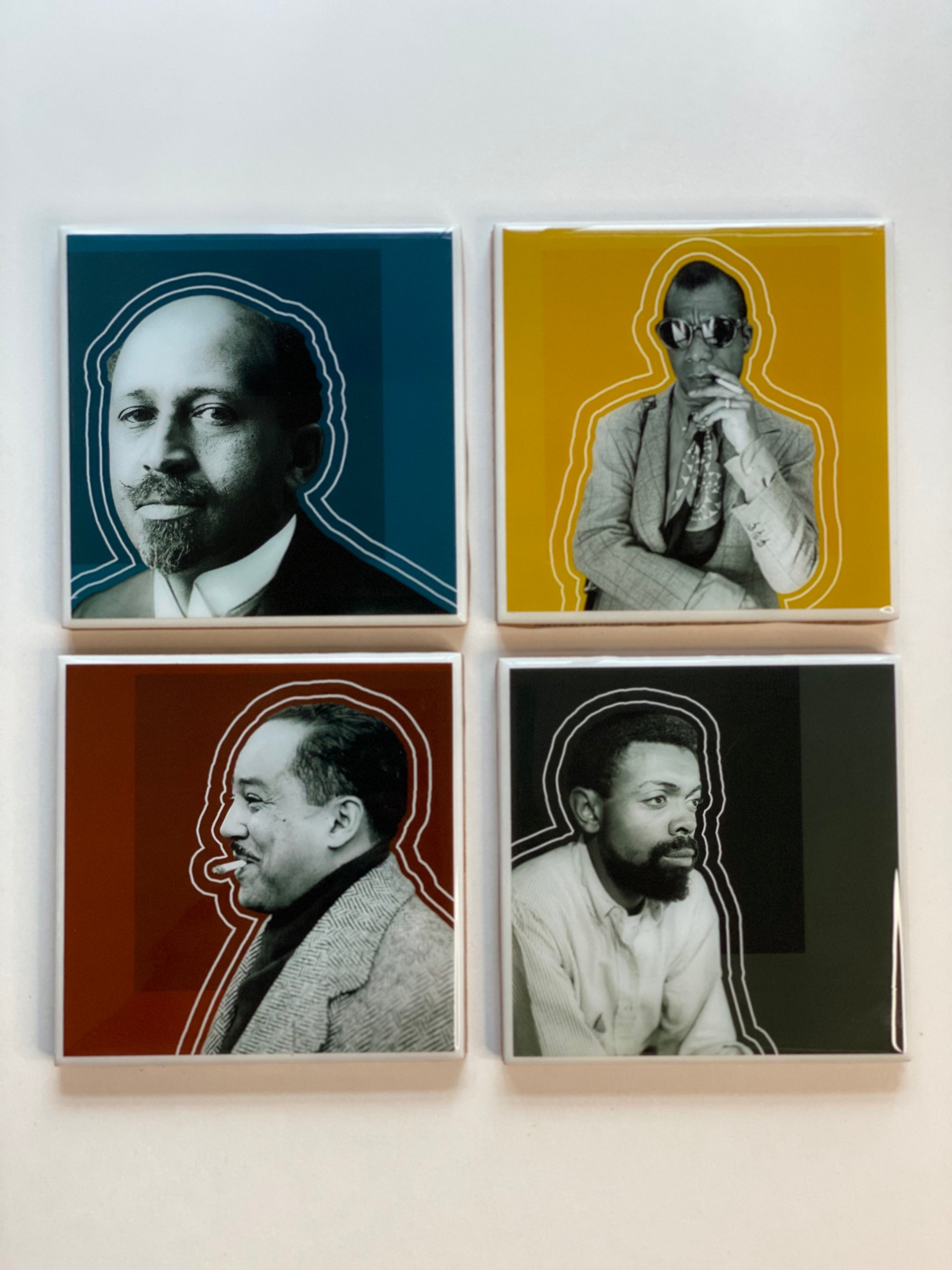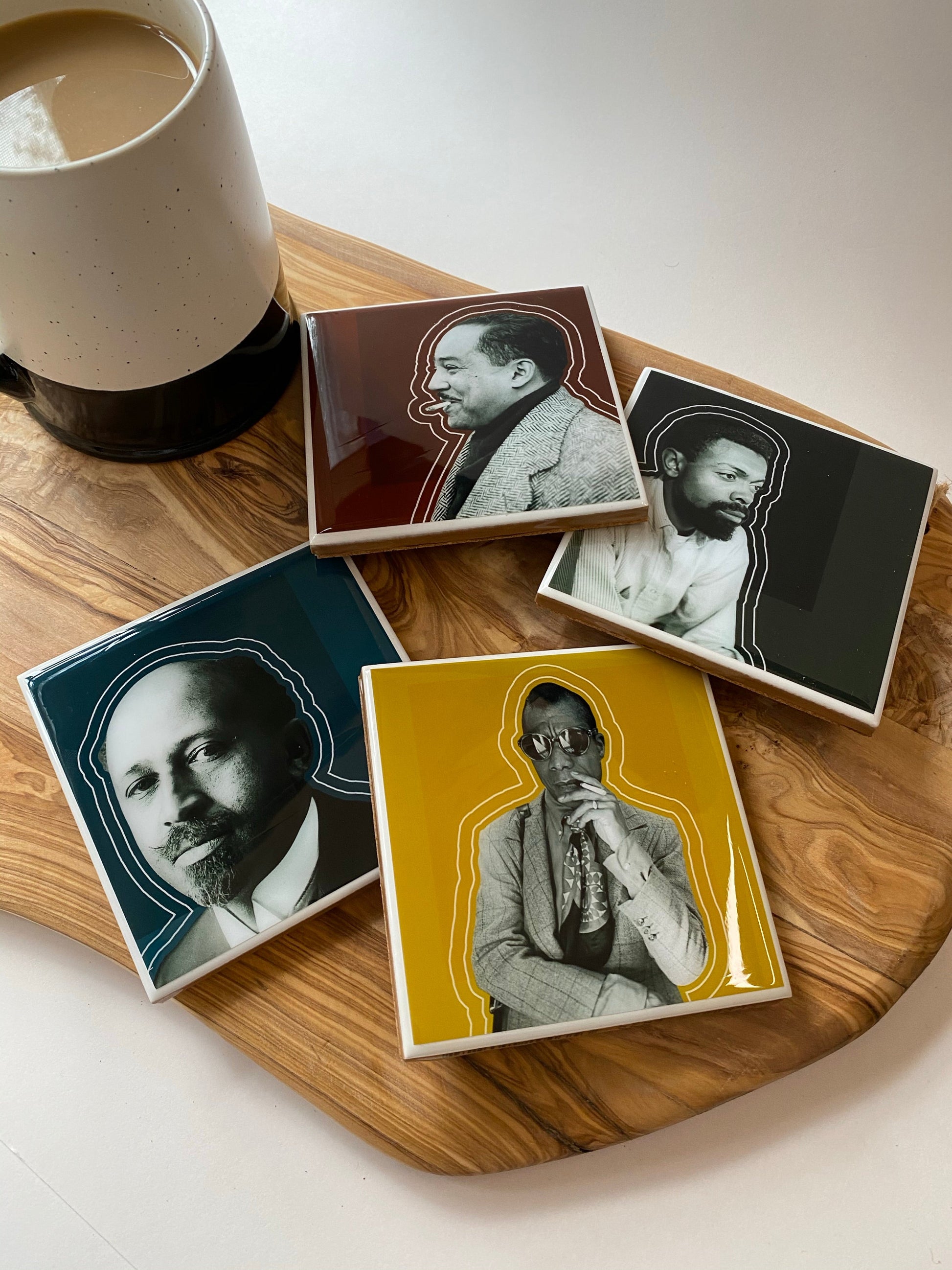 This set of four coasters features images of Black authors James Baldwin, Amiri Baraka, W.E.B. Du Bois, and Langston Hughes