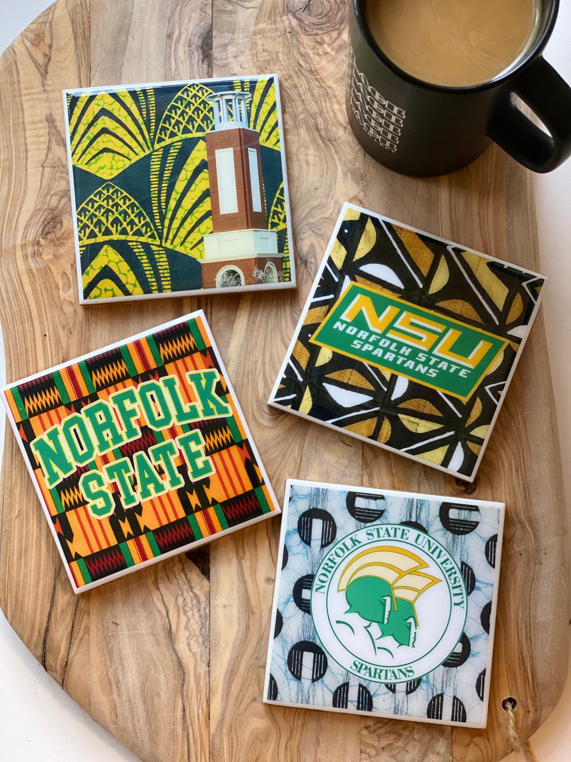 This set of four coasters features images from Norfolk State University.